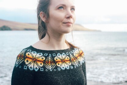 This jumper is my version of a traditional Shetland Yoke jumper, I have used raglan shaping before the yoke, a lower neckline and short row shaping to make it more modern. I used 5 contrast colours but the yoke would look equally striking in one shade. Ola’s Ness is an area located near to my Grandads Croft in Northmavine in Shetland and the graphic nature of the pattern reminds me of sunny childhood summers spent in Ollaberry in the 1990’s.