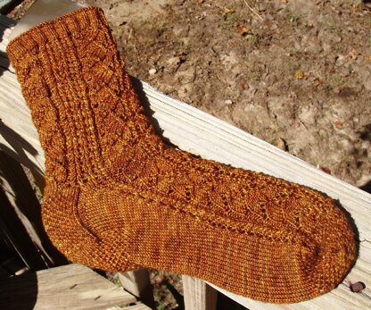 This is a lace sock that can be knit toe up or from the cuff down, with a slip stitch heel. There are 2 sizes, a 60 stitch leg and a 66 stitch leg. There is an option for doing the toe of the toe up sock in an eye of partridge stitch.