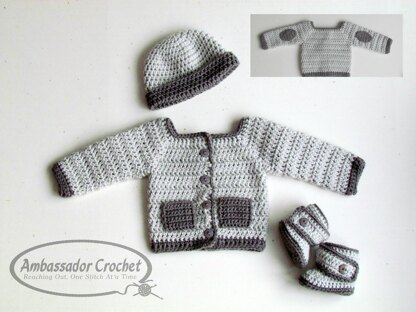 The adorable baby set was designed with that sweet little baby boy in mind. Complete with elbow patches, and "puddle jumper" booties, the pattern will have you wanting to make this set for the newborn baby boy in your life.