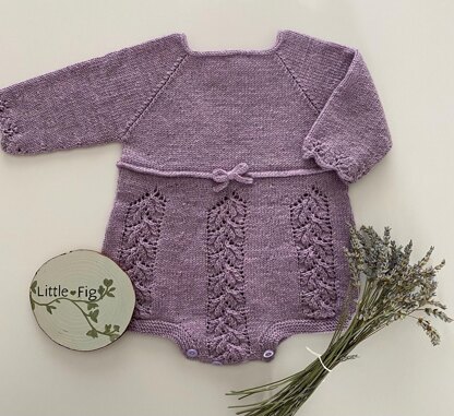 The romper is worked from the bottom up, with front and back crotch tabs worked separately, then joined and worked in the round. The 3/4 length sleeves are worked separately, then added, with the romper then finished in one piece. The high waist band is worked by creating a piping round, with the i cord bow worked separately and stitched in place.