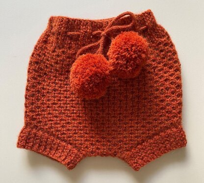 The bloomers are started separately, with the front and back crotch panel worked back and forth, then joined to work upwards in the round, using a circular needle. There is only one seam for sewing, which is the gusset seam. If you prefer to work front and back separately, and then side-seam, cast on 1 extra stitch on each side, and work this as a garter stitch edging stitch throughout. This will give a 1-stitch edge for seaming.