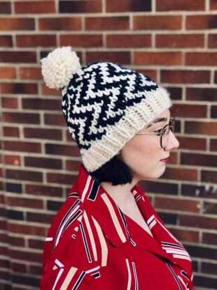 Knit in super bulky yarn, this hat features a geometric colorwork design. As a weaver, I often notice an overlap between woven fabrics and knitting possibilities. This particular hat design was inspired by a favorite woven pattern, point twill, which features the ever popular chevron pattern. Placed vertically, it creates a dramatic statement. Use two highly contrasting colors for a bold look, or two colors that are closer in tone for a more subtle design.