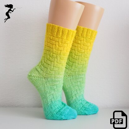 These socks feature faux cables paired with a basket weave pattern made only with knit and purl stitches. Perfect for beginners or for an evening of binge-watching TV shows. The pattern is easy to remember and the socks will be finished very quickly.