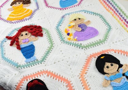 materials: Crochet hook size 3,5mm for the appliques Crochet hook size 4,5mm for the blanket DK weight yarn for the appliques and blanket We will need these colors: Snow white- yellow, blue, red, black, beige Cinderella- 2 shades of blue, beige, yellow Bell- yellow, brown, beige Ariel- beige, 2 shades of blue, red, purple Jasmin- black, beige, 2 shades of blue Rapunzel- 2 shades of purple, 2 shades of yellow, beige Tapestry needle Hot glue gun if you will stick the appliques with glue Safety eyes- 6 or 8 mm