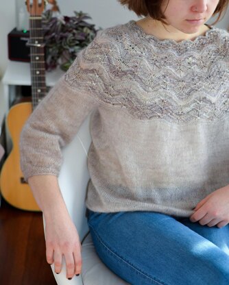 It is a seamless top-down sweater with a lace pattern on the yoke while the rest is made in simple stockinette. There are two options for yoke depth, and while the original was made with a deep yoke, you can shorten the yoke by 7 cm/2.75” by omitting CHART 4 (please refer to the measurements table).