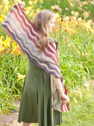 Stripes, ripples, lace, texture; Ondulation is perfect for showing off gradient or highly variegated yarns with plenty of bright colors! Designed for gradient yarns the long stripes and garter stitch will also break up any pooling caused by variegated yarns.