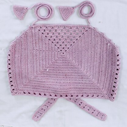 This unique granny square halter top has neck design already worked into the square. The top is tied back behind the neck and at the waist.
