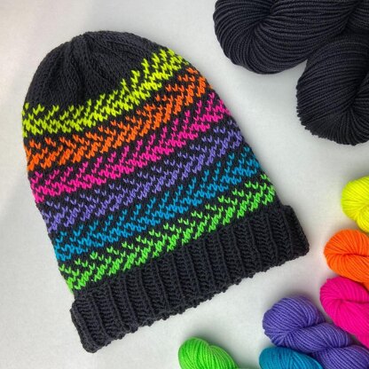 Knit with simple colourwork in DK, this colourful hat is a great weekend project and perfect for using up left over yarns and mini skeins. Worked in the round, with a MC and 4-6 contrast colours, the pattern is a combination of written and charted instructions. The hat comes in three sizes and sports a generous folded brim.