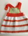 A pretty jumper with a touch of "overalls" style. Bold, textured stripes and a colorful bib make this a bright standout. Straps cross in back and button in front. Waistband buttons on left side. Works up quickly in worsted yarn but directions are easily adjusted for different yarns and sizes.