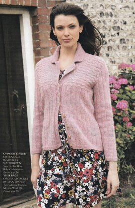 This is a pattern for Orchard Cardigan, originally published in Knitting magazine. It has a revere collar, moss stitch edges, and two textures in the pattern. The lower part is a simple knit with purl vertical lines, and the yoke is a knit and purl small scale chevron. Photo Laurel Guilfoyle for Knitting magazine.