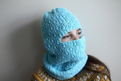 The balaclava is knit in the round.