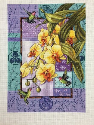 Designed by: Kooler Design Studio Welcome nature into your home with this breathtaking piece that flaunts gorgeous hummingbirds and cascading yellow orchids. The background of lavender and aqua have Asian motifs, bamboo border and layers of detail not usually seen in cross stitch. We are proud of this elegant design.