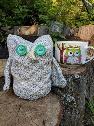 Oriana is an adorable owl with a character. She is approximately 6.25" (16 cm tall). This owl is worked from the bottom, in the round from center out. The body has a Saxon braided cable in the front and in the back. The head has simple stockinette stitch. The top is closed with Kitchener stitch. Two wings are knit separately and sewn on, or simply pick up the CO sts on the sides of the body at the beginning of stockinette stitch section. The ears are created by sewing through the top to the bottom a few times. Optional is to use knitted eyes instead of the two buttons. The beak is knit in the round and sewn on. Suggested yarn: Worsted weight yarn.