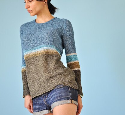 The loose fitting Pullover with overall texture in two different stitch patterns proposes variation in colour blocking and graded striping. Orza¹ has an asymmetrical raglan shoulder with a deeper, rounded shape in the back, reminiscent of racer back tops and worked in a different ratio at the front and the back of the raglan construction. A slightly wavy, high crew neck balances out the horizontal striping, while the option to choose from two different versions for the sleeves (or to make both as shown) give this jumper a sportive feel and make for a fun piece.