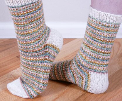 Using five colors of left over sock yarn, this pretty sock is worked with only one color at a time. A simple slip stitch pattern looks much more complicated than it is.