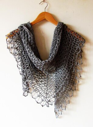Inspired with a special charm of rainy days, this rustic shawl looks like a piece of nature. With it's gorgeous mild drape you can wear this shawl as a scarf or kerchief. Easy and quick project, but needs good blocking to open up the lace pattern.