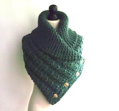 Cosy up in this smart collar worked in a super bulky yarn. Interrupted rib sits alongside a garter stitch collar. Some short row shaping is worked on the collar and simple knit into front and back of stitch increases are used to create the collar width.