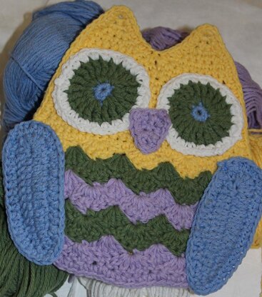 This owl hot pad protects surfaces from scorching with style. Single crochet stitches provide the shaping along the head, while rows of shell stitches in green and violet add "feathers" to the body. The details, eyes, beak, and wings, are then crocheted and sewn on. Over 20 pictures help you complete the steps.