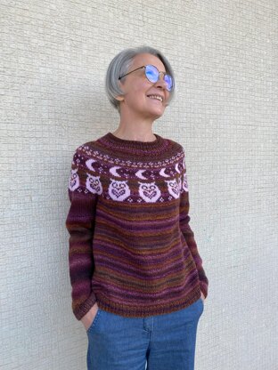 This sweater is worked seamlessly from the top down. Short rows are added to shape the neckline and then the stranded yoke is worked. The sleeves and body are separated and worked in the round.