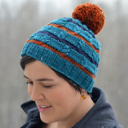 The irresistable combo of cables and stripes make this hat an addictive and quick knit, and it gets even better when you replace some of those plain cables with miniature owls. Keep it as written for a few owls peeking out amongst the plain cables, or take it up a notch and replace all of the plain cables with owls! Fun stripes offer the opportunity to use up scraps or mini skeins and mix it up with as many different colors of yarn as you desire.