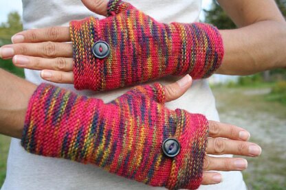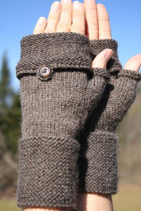 These fingerless mitts feature a stylish fold back flap that bottons. The mitts are worked in the round with sport weight wool.