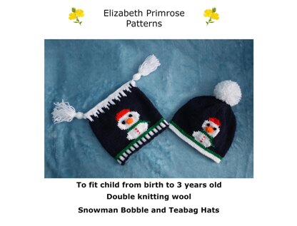 Pattern 1 is for a bobble hat with a snowman motif and pompom. Pattern 2 is for a teabag hat with snowman motif topped with icicles and completed with tassels. Both hats are knitted flat on straight needles and a chart is provided to complete the motif.