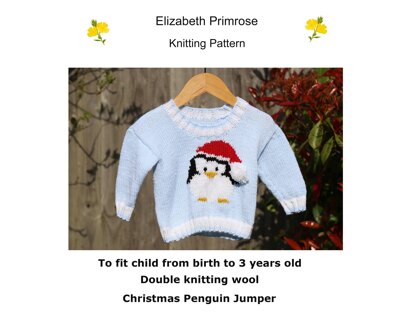 Xmas jumper to knit with Christmas penguin motif and 3 button opening to one shoulder