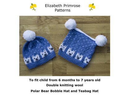 The Bobble Hat and Teabag Hat are both knitted flat on straight needles and a chart is provided to complete the polar bear motif. The bear and snowflakes are created using the fair isle method stranding colour not in use at the back and the bobble noses for each bear are knitted separately and sewn on. Pompoms complete the hats.