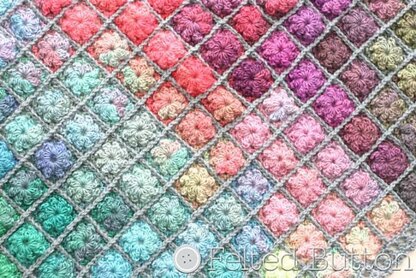 The sample was made with Lion Brand Wool-Ease (border) and Red Heart Boutique Unforgettable in Parrot, Winery, Echo, Petunia, Tidal, Dragonfly and Candied for the flower motifs.