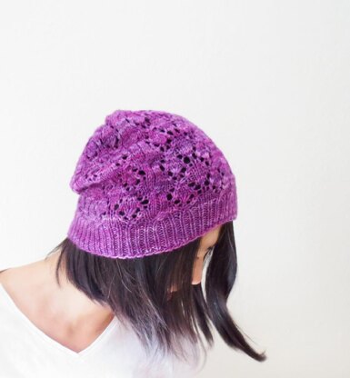 A hat that incorporates both cables and lace, worked from bottom up in round.