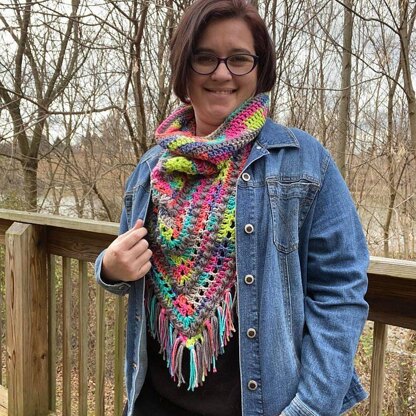 This scarf is made for the warmer months. It's not bulky and is the perfect accessory to a denim jacket, or any maxi dress. It has a collar that is open in the front so it allows more air flow. It's also great for those who do not like things to hang tightly around their neck. The triangle is created from the top down. Then you reattach the yarn and work from the bottom up on the collar.