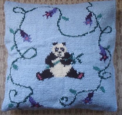 Pattern for a knitted cushion cover featuring, on the front, a panda holding a stem of bamboo across his tummy and surrounded by a twirling climbing plant with bell-shaped flowers. The climbing plant twirls over the back of the cushion cover too.
