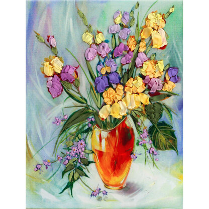 Kit contents cotton mouline threads on the holder, seed beads in some kits, ribbons, a needle, canvas, instructions, a pattern and a legend.