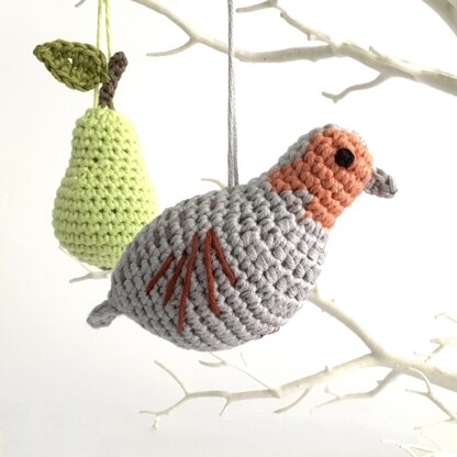 Crochet pattern for a partridge and matching pear ornaments. Ideal Christmas ornaments.