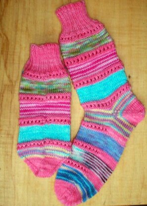 After finishing a pair of socks, every sock knitter has leftover small amounts of beautiful yarns. Stack up these different flavors of yarn like layers in a party cake. Separate each layer with a spread of eyelet frosting and you've created another delicious pair of socks. Each layer will remind you of a pair of socks that you knit. These socks feature a Turkish (afterthought) heel.