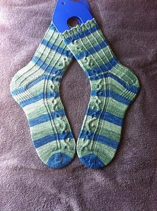 Let's Celebrate is a perfect toe-up sock pattern for a birthday, homecoming, or new year. I combined this cable with a twisted stitch ribbing and placed it asymmetrically on instep, leg, and heel flap. The cuff is worked in a vertical drop stitch. Directions include reinforced heel, and options for tapered or rounded toe, generic or calculated foot length, and Russian or picot bind off. References provided for most techniques.