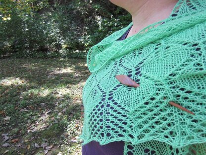 The clover and tiered-leaf motifs of this large lacy shawl are meant to evoke the meadow and Party Tree where Bilbo and Frodo Baggins celebrate their shared birthday in the first chapter of J.R.R. Tolkien's The Lord of the Rings.