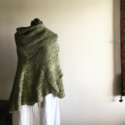 Easy to make, and a lot of fun to knit. Lays perfect on your shoulders. The “body” of this big wrap is worked in the round. Decrease some of your stitches and the next step, the “skirt” is worked back and forth with some fun simple lace increases. No picking up stitches. Then go on for as long as you like, or your yarn last.