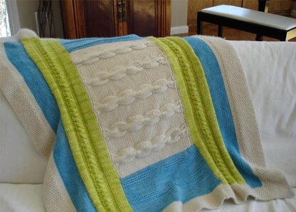 800 yards of worsted weight yarn (ivory) 400 yards of worsted weight yarn (lime) 600 yards of worsted weight yarn (blue) #8 needle Cable needle