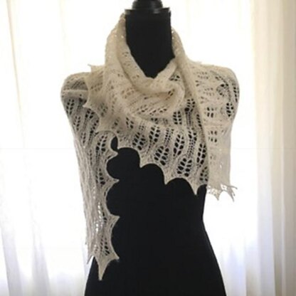 The lace is charted. The chart is large and easy to read. Complete directions on working from the simple chart are included as is a row-by-row direction for knitting the shawl. Shaping is accomplished with simple wraps and turns. Complete directions are included along with an illustration.
