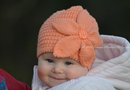 The hat is cozy and easy to knit. It has beautiful flower at the front. This hat is knitted in the round so it has no seams. I made the baby hat in beautiful orange color using Sublime cashmere merino silk DK but actual color and type of yarn can be varied.