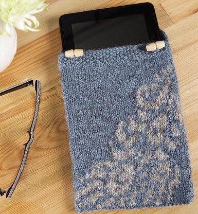 Keep your precious gadgets safe with this pretty cosy, featuring a peacock feather stranded motif.