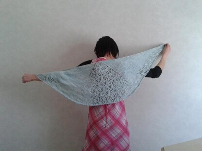The peacock became an almost universal symbol of the Art Nouveau movement. With its striking colors and flamboyant tail, the peacock was stylized onto everything from jewelry and dresses to vases and book plates. This top-down shawl, with its dramatic curving edges, pays homage to the peacock tail with a center panel of “eyes" and a sweeping border of “feathers".