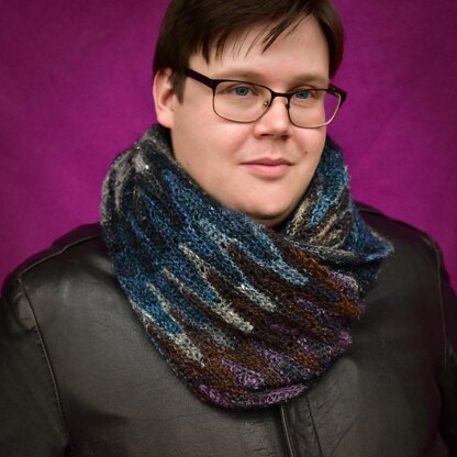 This unisex scarf has an extreme chevron motif evoking the image of a forested mountain range with peaks and valleys. Worked in a self striping yarn, this scarf will take on the personality of the any colors you choose, ranging from bright and cheerful to dark and subtle.