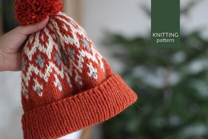 Yarn: 3 shades of Drops Nepal (65% wool, 35% alpaca, ca. 75 m in 50 g) or any similar non superwash yarn to match the gauge. Color 1: ca. 80 g (orange 2920); Color 2: ca. 20 g (off white 0100) ; Color 3: ca. 5 g (grey 0501); ca. 18 g for a big pompom.