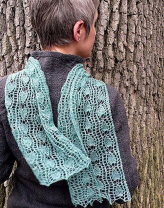 Solid pear motifs appear suspended along the open trelliswork of this sheer scarf. The scalloped hems and meandering path of the openwork are the result of the horizontal expansion and contraction of the stitch pattern. This is a great on-the-go project, with lace knitting on right-side rows only and “rest" rows entirely in purl. Use of a different weight yarn and/or needles will produce a variation in overall size.