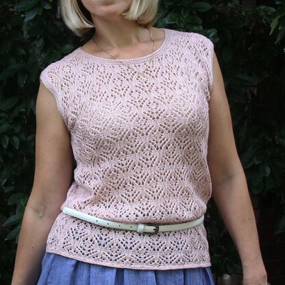Pearl Flowers Top has a straight silhouette and a small positive easy. The back and front worked in a beautiful lace pattern. All details are knitted separately, then sewed together. The finish of the neck and armholes is made in Garter stitch.
