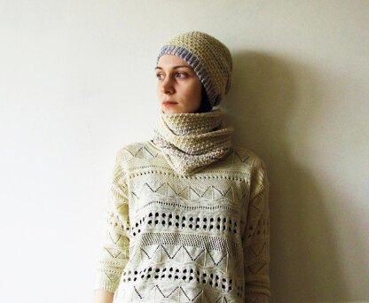 The textured stitch used for this pattern reminds seed stitch in knitting, I named it "pearl stitch". Hat and mitts are crocheted from the bottom up with 2 strands held together – main color (Sport weight) and accompanying (Light fingering). If you prefer to make it in a single color, use one strand of heavy DK or Worsted weight yarn (check your gauge).