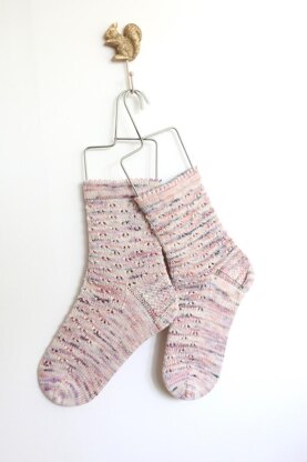 A beautiful and simple eyelet design gives a pretty touch to these socks with a delicate picot cuff. Worked from the cuff down using a square heel.