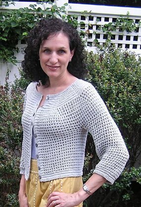The Pebble Cardigan is knit from the top down in one piece. The button and buttonhole bands are picked up and knitted on at the end. The top down construction allows the knitter to try it on while knitting. The pattern allows for the garment to be lengthened or shortened. The sleeves can also be made short, ¾ length, or long. Try it on as you knit and see how you like it best.